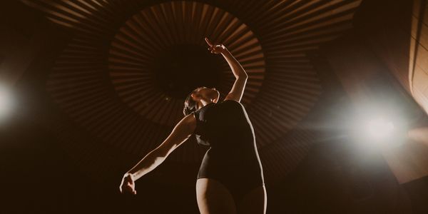 A dancer wearing a black leotard points to the ceiling as lights sparkle around her.